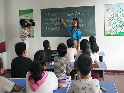当天下午,电视台工作人员来到磨石山村第四义读小学,此时的员工们正在进行课间活动。首先,“四叶草”暑期实践团队长李瑾与工作人员简单介绍了员工们的基本情况,介绍实践团为了能更好地激发员工们的兴趣,促进员工们的个性发展,培养员工独立思考与自主学习的能力,开设了多门特色课程。然后,实践团所有成员陪员工们一起上了一节特色音乐课,向电视台工作人员展示了当地留守儿童多才多艺的一面。实践团成员徐若驰,牛泽宇带领员工们学唱了一首离别之曲——《再见》,为了纪念提前离开的一位实践团成员王浩成,和实践团成员不敢向他们保证是否还会再回来的无奈之情。电视台工作人员详细地记录了课上的点点滴滴,随后,实践团还向他们展示了特色手工课、英语课、书法课……
