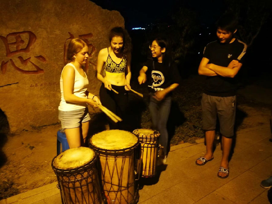 首先接连表演了两首经典曲目——《Macru》与《Moribayassa》。演出伊始,社团成员们在路灯的照耀下打响铿锵有力而富有节奏的鼓声,观众们开始沸腾起来。紧接着,由社团的骨干成员张德泉表演了一段令人振奋的solo,使观众们的热情更加高涨,纷纷鼓掌叫好。顺承着观众们的热情,四位社团成员伴随着dundun表演了一首《Balakulandjan》并分别进行了一段个人solo。最后,伴随着观众们的掌声出场的是社团会长——曹慧和社团成员——王犇,他们应和着社团骨干——李扬阳的solo及其他成员的伴奏上演了一段激情飞扬的非洲舞,将观众们的激情推向了顶峰。舞者们脸上洋溢着自信的笑容,通过舞蹈展现生命的活力。非洲鼓舞相呼应和,共同促成了一场视觉与听觉的盛宴。演出顺利结束后,对非洲鼓产生兴趣的同学们纷纷上来尝试打鼓,甚至吸引了许多外国职工,社团成员认真地给他们进行基础鼓点的教学,大家交流学习,其乐融融。最终,路演在大家的欢声笑语中结束。