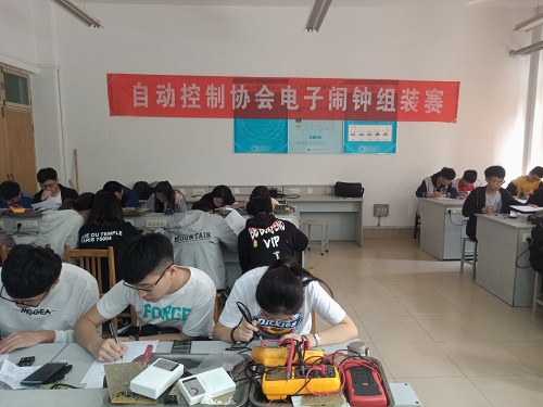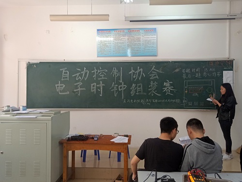 首先,自动控制协会的会长,协会各个部门的部长以及干事们提前入场并进行签到,随后他们又布置会场,为参赛的人员们准备好所需的材料和工具。参赛人员们提前到达了会场进行签到,并做了一些准备工作。他们在电子时钟组装赛前温习了一下群里发的题库,以便在比赛过程中可以更好的节约时间。在两点整,比赛正式开始。财务部部长王素环讲解注意事项,随后,协会的干事们开始分发比赛器材以及笔试的试题。参赛人员都非常认真的听王素环的讲解,并积极地拍下黑板上的线路图。首先开始的是笔试部分的知识竞答,限时15分钟。随后,协会的干事们开始收取知识竞答,参赛人员们开始组装焊接电子时钟。参赛人员们根据自己组成的小组进行焊接工作。他们参照着说明书以及详细的安装流程进行操作。总计时一小时,完成后参赛人员们便可上交自己的作品。最后由自动控制协会内部的工作人员进行作品的评比以及活动总结。