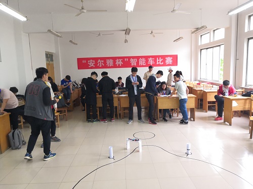 比赛开始前,为了做好充足的准备,工作人员提前到达318号教室布置场地。比赛开始前的两个小时,是调试小车的阶段。由安尔雅创客协会副会长曹雪涛带领相关工作人员给参赛者提供帮助,以便于他们调试小车。在工作人员的帮助下,各参赛队陆续进入小车的调试场地进行调试。调试结束后,比赛正式开始。各个工作人员,按之前协会里的任务分工,开始给各个车队排序,进行盗梦空间签到等。同时,曹雪涛讲解比赛规则,比赛要求小车能过标准门,可以寻迹、清障,同时小车速度也会影响到打分。比赛开始,各车队按照序号有次序的上场比赛,参赛者们也围成一圈在观看其他队的赛况,从而改进自己小车的不足。与此同时,协会的工作人员开始测小车各项数据,开始计分,进行比赛的拍照。经过一个多小时,比赛接近尾声,工作人员开始统计最后的分数和排名,并将结果发到参赛群里。曹雪涛宣布比赛结束,至此,比赛顺利结束。
