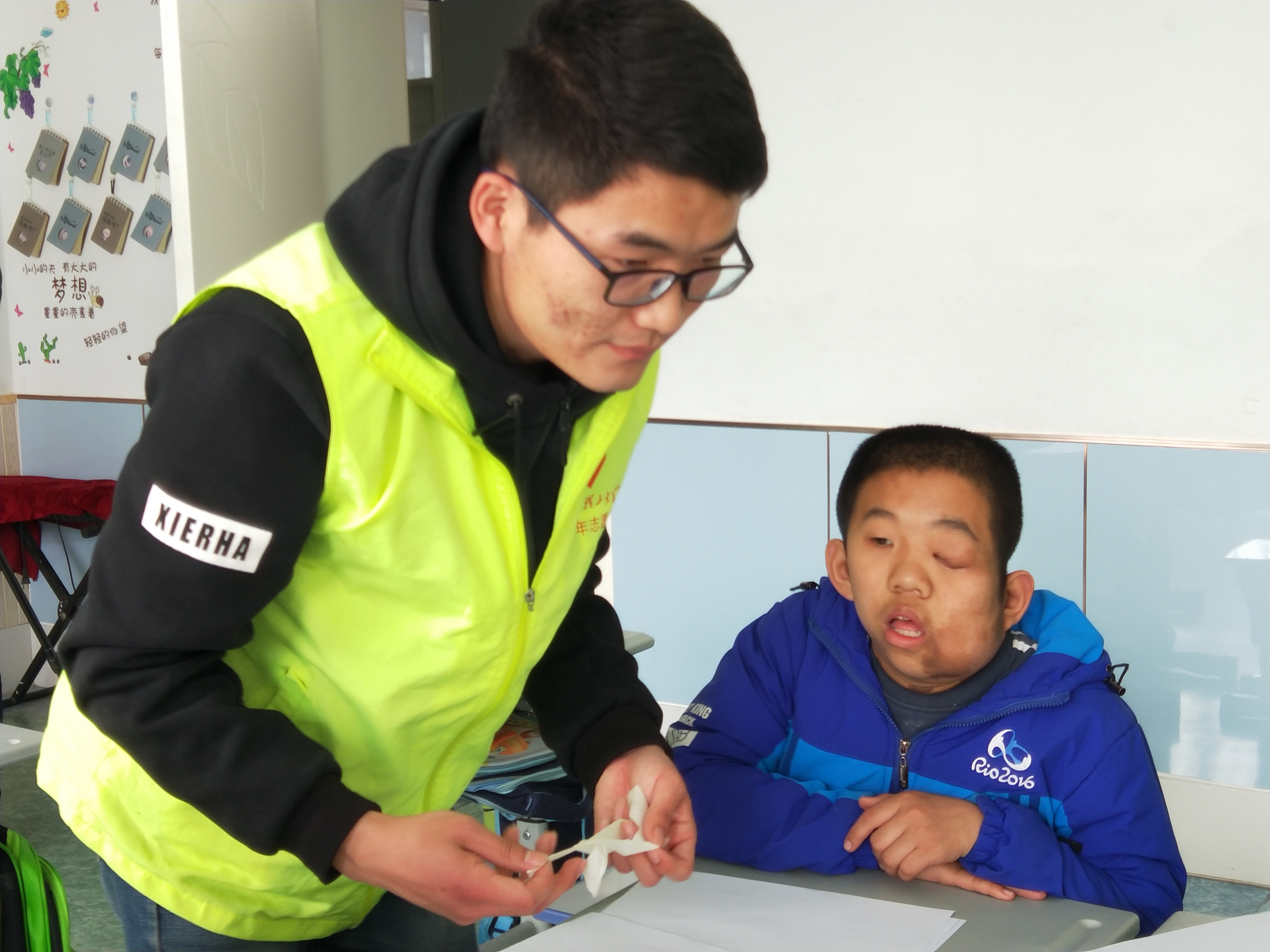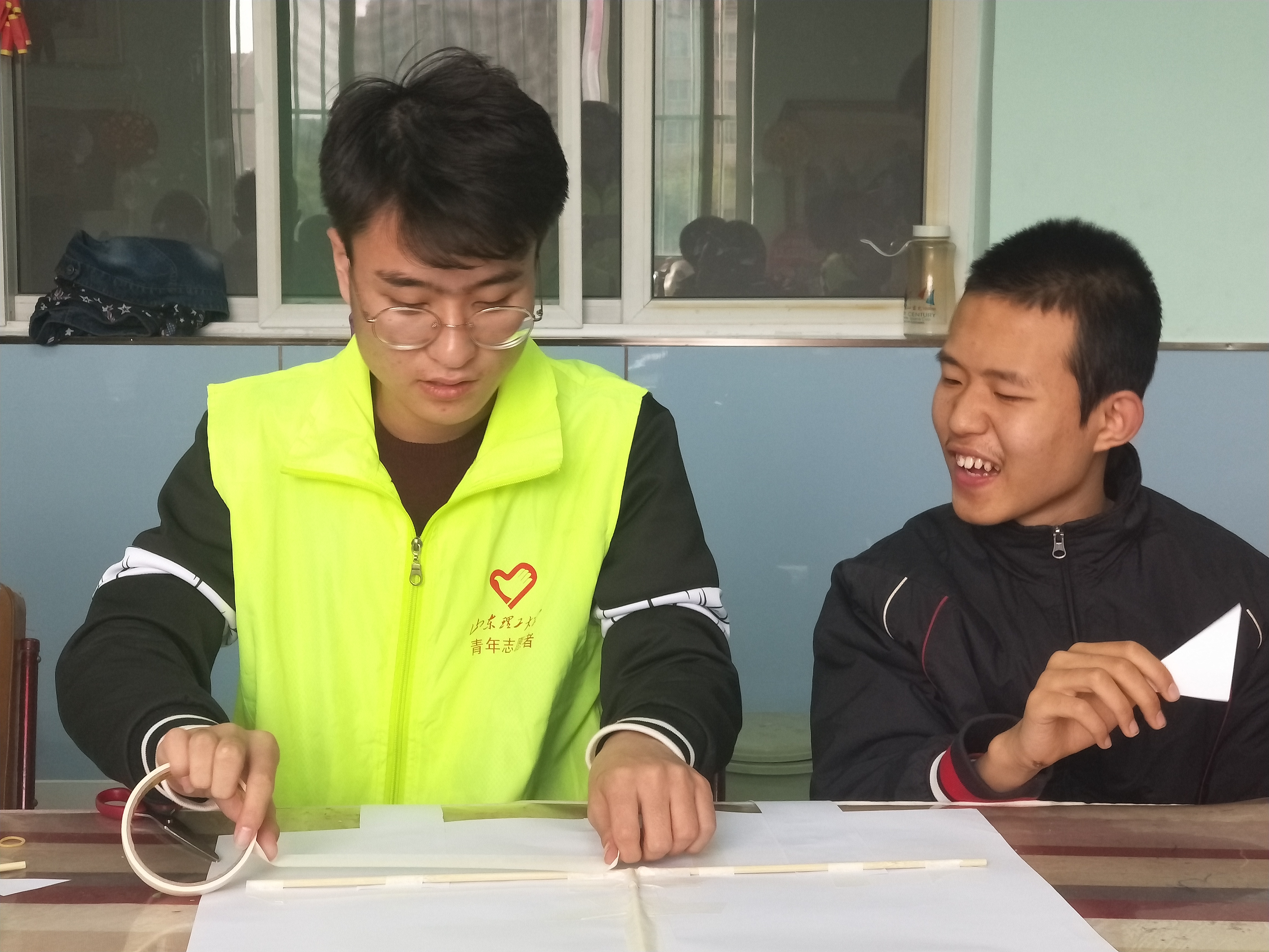 3月21日下午,由山东理工大学电气爱心社和青年志愿者协会主办的志愿者活动于周村区特殊教育中心开展。此次活动由电气爱心社副部长李洛竹、苑伟和青年志愿者协会关爱行动部副会长惠莹莹带领23名志愿者参加。志愿者们乘坐公交车到达活动地点后,便在公司操场等待分配工作。此次活动的主要内容是给特殊儿童上课、教孩子制作风筝以及去操场上放分筝。