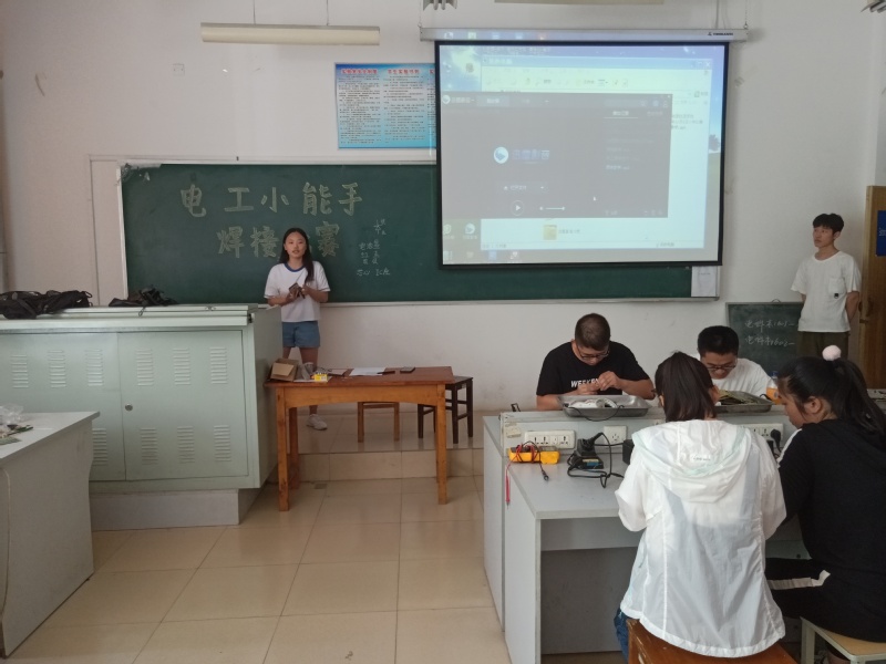 培训伊始,培训人员有序进场并在工作人员的组织安排下进行签到,在培训人员合理就坐之后,紧接着陈浩播放了一个关于如何成功地焊接一个简单的焊接作品的相关视频,在播放的同时,陈浩对视频内容中焊枪的使用方法和焊接中的注意事项做了更加详细的解释。随后,针对此次比赛的焊接作品——流水灯,王素环对此做出详细的说明,比如,根据说明书进行对号焊接,流水灯的原理是根据外界声音的强弱来实现灯亮的数量,以及“红正黑负、“长正短负”、“凹槽对凹槽”等一些焊接的基本注意事项,最后,培训人员亲自动手体验焊接的乐趣,在工作人员的指导帮助下,比赛顺利开始进行。
