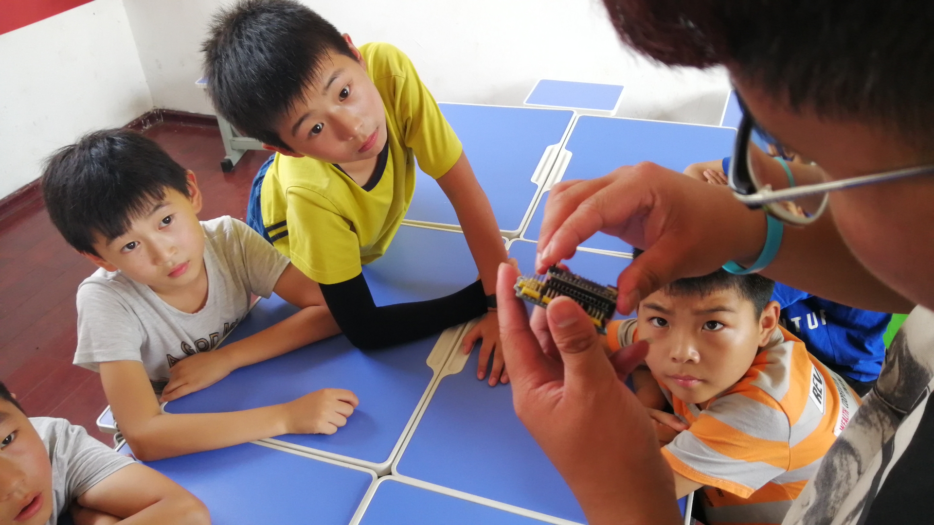 上午,实践团成员杨义鑫和王耀德借助循迹小车对孩子进行创客教育,意在激发孩的新意识和创新兴趣。在课前,杨义鑫和王耀德将循迹小车进行拼装,并将控制程序导入到小车的主板上。在课上,两位成员首先向孩子们展示小车的运行。之后,便将小车的零件依次向孩子们展示,同时,还将零件的功能和使用方法一一向孩子们展示和讲解。将基本的内容讲解完之后,孩子们便开始互相商议并分组合作,一步一步的摸索着拼装小车。