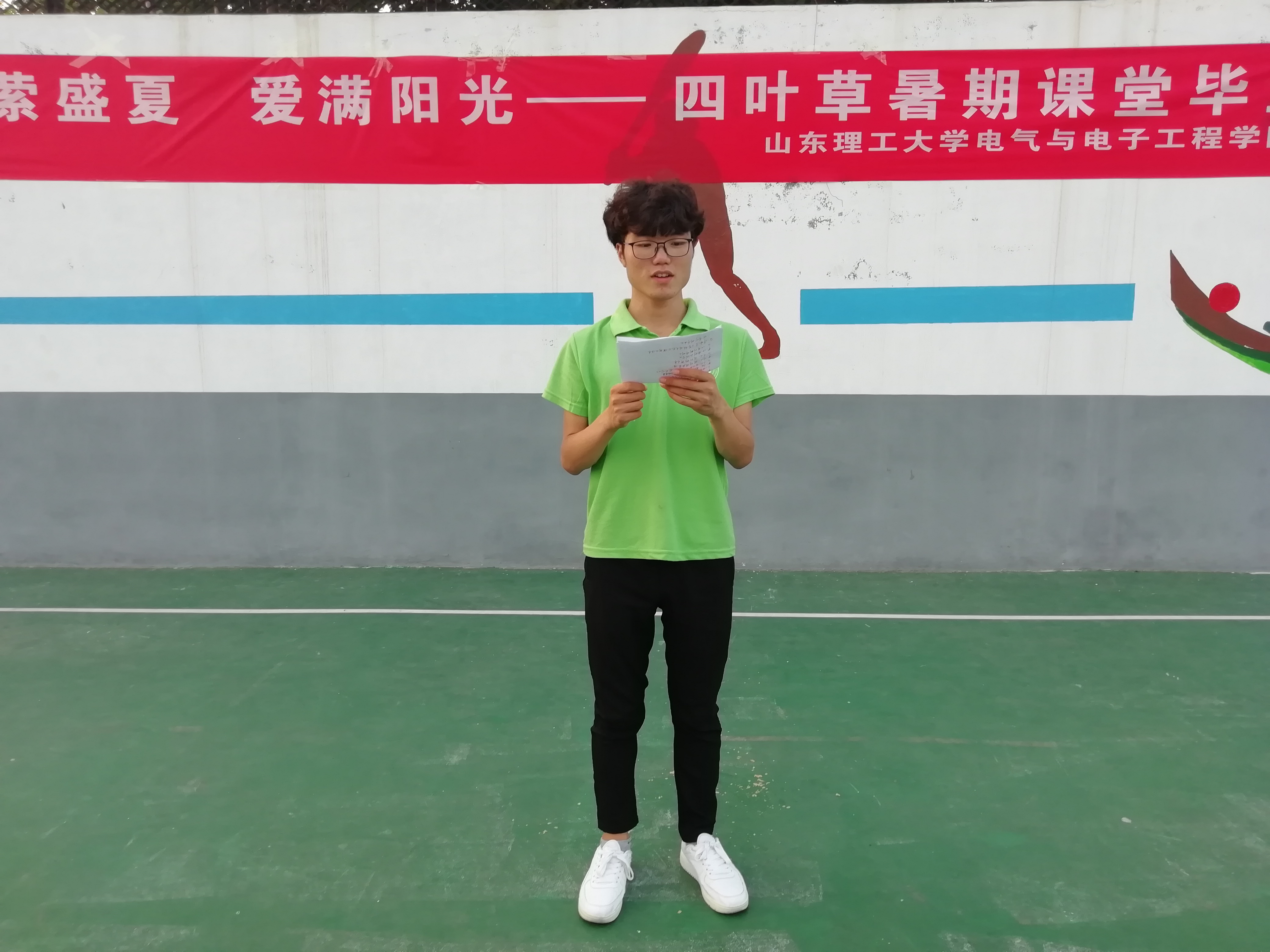 首先,"四叶草"暑期社会实践团博山支队队长华洪运发言,他希望在这短暂的二十天里,同学们能有所收获。同时,希望参加社会实践的队员们珍惜锻炼机会,增强自身责任感和使命感,用所学知识回报社会,实现自我价值,用真诚关爱的心帮助农村儿童。希望孩子们在社会各界的帮助下,努力学习,心怀梦想,茁壮成长。