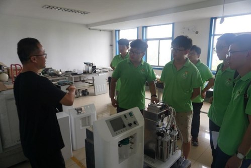 在装配车间,重点参观了一种家用制氧机,这种制氧机可以在家中使用,免去了前往医院吸氧的麻烦,制氧机采用了分子筛制氧,分子筛可以像筛子一样,滤取空气中所需要的氧气供人使用,由于空气中的其余成分不能在制氧时排出,这些成分过多的积累会影响制氧,所以该制氧机采用了两个分子筛,一个制氧的同时另一个排出空气中的其余成分,保证了制氧的效率,同时也提高了持续制氧的能力。在与公司负责人的交谈中,队员们也意识到了医疗器械研发的艰难,一件好的医疗器械从研发到上市销售通常需要5、6年的时间,甚至更长,其中最艰难的部分的就是要200例以上的经历临床检测,患者的不认可不信任是其最大的阻碍。