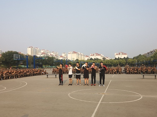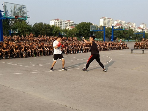 各社团准备好后,路演开始。搏击健身社的路演节目处于整个路演节目的第四位,经过主持人的一番介绍,搏击健身社的几位成员开始到军训队伍中央为大家进行搏击健身的表演。首先,搏击健身社成员先用搏击健身的方式向大家问好,随后便开始表演此次表演分为两项,一是打靶,二是踢腿。表演者护具装备齐全,稚嫩的面孔在人群中央上却显得十分老练,显然训练和准备充足。直拳、勾拳、摆拳拳拳力度到位,打发有章有节,观赏感十足。虽然都是几个简单的动作,却打出了一番热血和正气,无论从战术、技巧、体能等方面都经过严格的训练,实战感十足,尽展自由搏击运动的魅力。周围观众鼓掌呐喊,展现出全民健身理念已深深刻在同学们的心中。表演完毕,搏击健身社表演者向大家行礼,伴随同学们的掌声退场。