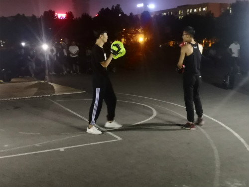 路演开始前,博击健身社成员提前到场,并做一些适当的热身运动,把身体调整到最佳状态。路演正式开始,博击健身社成员们以标准的抱架之礼,以示对拳击的敬谦。首先,他们表演了基本功空击。空击包括直拳,摆拳,勾拳,冲拳。他们喊着响亮的口号,动作整齐而有力体现了博击健身社的高素质与高水平。随后,表演者们又向观众们展示了招牌腿法,包括鞭腿,正蹬,侧踹。他们的动作利落漂亮,显现着表演者的专业。同时,他们与观众进行了互动,现场气氛逐渐活动起来。接着,博击健身社向观众们展示了实战表演。对打中,他们专注且快速,拳头的碰撞,身体的碰撞显现了表演的精彩。社团老将的对打引起了全场的掌声与喝彩。最后,博击健身社路演活动结束了。
