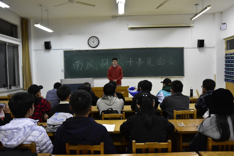 为强化干事理事能力及组织能力,10月26日晚,风羽毛球协会于13教315教室举行“干事会议”,今晚新加入的干事及旧干事在此进行培训,此次培训的内容主要是对近来发生的一系列问题进行的陈述,并提出相应解决问题以及关于未来南风羽毛球协会的发展方向等。