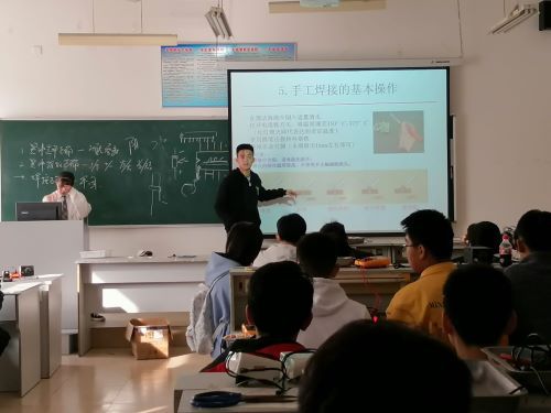 培训开始之前,为更好地服务培训的员工,电协骨干成员对电协所有干事进行细致的焊接培训。随后,各位同学陆续来到教室,并对焊接器件进行初步了解。培训正式开始,技术部干事以PPT和现场演示的方式对焊接的流程,方法以及注意事项等进行讲解。接着为同学们播放有关焊接的视频,包括焊接的错误示范,以及正确的方法,同学们以饱满的热情认真听取所讲解的内容。接着电协为在场的同学发放焊接所需的器件,让同学们亲自感受焊接的乐趣,并给予他们现场的指导。