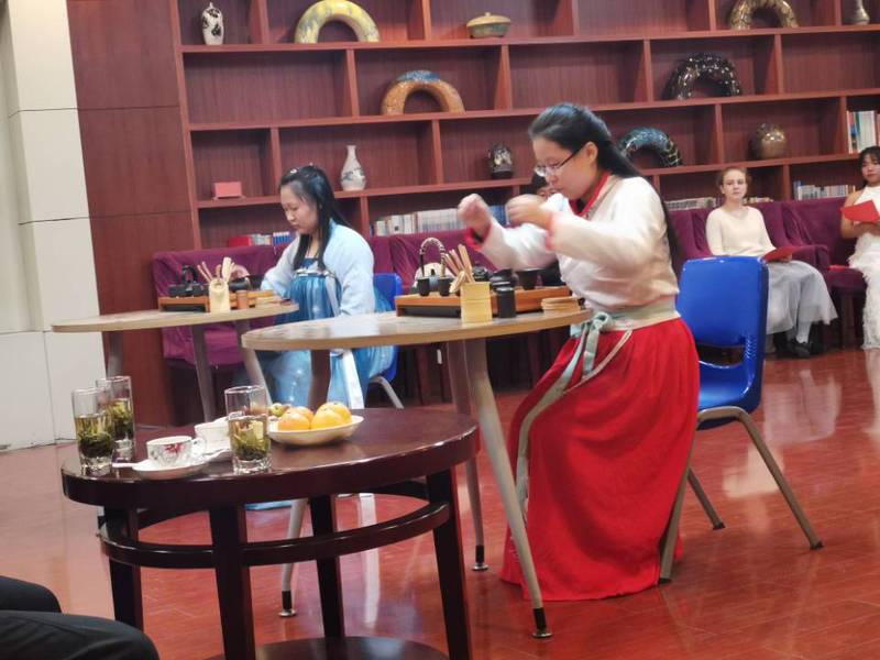 活动伊始,茶艺工作室进行了极具古典文化特色的茶艺表演,张铜通读了茶语,典雅的古事弹奏配有啊娜多资的汉服舞蹈,活动现场充斥着古典文化的气氛。古等声回环曲折。动听婉转,余音景表,不稳如楼。陈阳文表演了瓶滚绣球,高山流水。悬壶高冲,洗去深尘,一品位爽等乌龙茶的表演,引来了同学们的喷睛称赞。在场的还有外国窗员工,他们无不被茶艺表演的唯美所吸引,表现出了对茶文化的赤量和向往.张银为在场的各位送去了刚泡好的茶饮,品名幽否.通过亲自品茶.大家对茶文化有了更加真切的感受.最后张辑组织干事将纸怀等物品收拾整清,还原了难美整洁的教室。