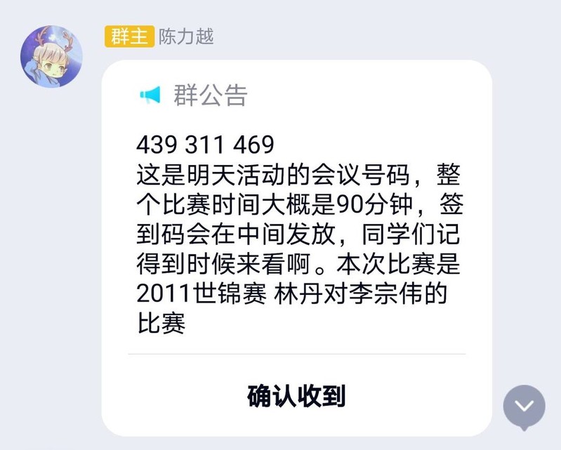活动伊始,陈力越将活动会议链接发送到相关QQ群,参与人员陆续加入会议。随后,陈力越简述了“林李大战”视频的内容:2011年世锦赛林丹与李宗伟的比赛是男单决赛的一场比赛,林丹在先败一局的情况下,连胜两局,决胜局林丹利用漂亮的突击和多变的球路才以微弱的优势战胜李宗伟,拿下世锦赛冠军。紧接着,陈力越播放这段精彩的视频,参与人员认真观看,并在讨论区积极发言。最后,陈力越对羽毛球比赛进行了简单概述,主要从基本的身体素质、必备知识和技巧、赛时注意规则三个方面进行阐述。同时,结合他自己的参赛经验向同学们介绍比赛时可能遇到的状况,分享了自己在羽毛球运动中的一些技巧,让参与人员对比赛可能遇到的问题以及比赛需要注意的事项有了较为深刻的了解。