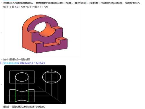 活动开始前,同学们陆续进入线上活动群,由喻思倩介绍此次活动基本流程,并对同学们的到来表示由衷的欢迎。活动伊始,喻思倩发布答题试卷二维码,同学们可扫描二维码进入答题。此次答题时长为150分钟,90道选择题,1道主观绘图题,满分为100分,答题者需限时完成题目,拍照上传绘图图案并附上自己的班级姓名学号。选择题为AutoCAD软件的各种基本知识,主观绘图题题目是根据立体图画出三视图,要求主观绘图题提交答案如同工程制图三视图的基本画法。随着活动进行,线上活动群的人数逐渐增多。喻思倩提醒同学们及时提交试卷,注意考试事项。活动过程中,喻思倩积极负责,同学们认真答题。活动结束,二维码试卷通道关闭,协会将根据绘图以及答题情况评选出各类奖项,一经评选,将会及时公布获奖名单。