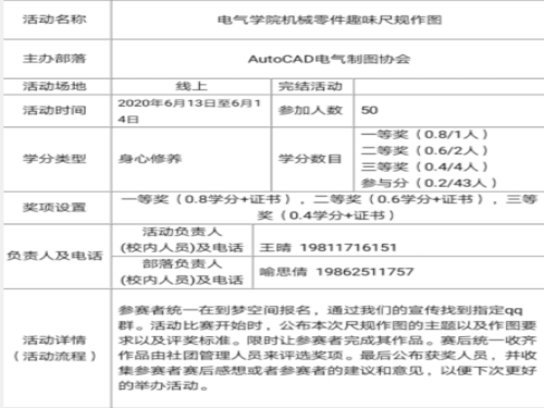 此次活动锻炼了同学们的绘图能力,考验了同学们对CAD制图软件的基本使用技能,使同学们能够更好得了解关于CAD制图知识,为同学们之后的学习打下基础。