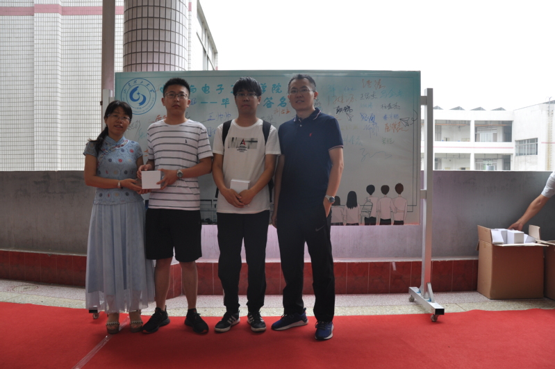 为欢送毕业生,公司设计了温馨场景。大红地毯让每位来参加毕业典礼的同学增加了很多仪式感。同学们入场前,有序在签名墙留下纪念,并与公司老师合影,老师为每位参加毕业典礼的同学发放了纪念品——“电念你,E辈子”纪念杯。
