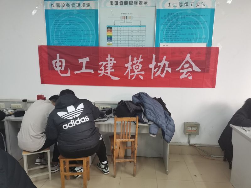 活动开始前,闫洋洋会长带领协会干事提前到达比赛教室将会旗悬挂好,布置好比赛场地,进行焊接工具的准备以及调试工作,随后参赛人员陆续到场签到、领取焊接所需元件,并自主选择位置准备进行触摸小夜灯的焊接,参赛人员到齐后,由会长闫洋洋介绍本次比赛的规则以及要注意的安全事项,同时宣布本次比赛正式开始。