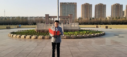 6点50分,迎着朝阳,伴随着激昂的乐曲,山东理工大学国旗护卫队的队员们迈着整齐的步伐护卫着五星红旗走过师生方队,走向升旗台。庄严的国歌声中,现场师生肃立整齐,齐声高唱《义勇军进行曲》,鲜艳的五星红旗在全体人员的注目下冉冉升起,随风飘扬。