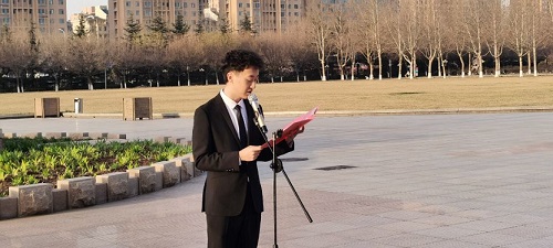 随后员工会执行副主席、电信1801刘坤做国旗下“勇担时代重任,追求崇高理想”主题演讲,“新青年就是要在初心中找理想,在时代中练本领,在斗争中显担当”。他表示二十一世纪是对我们当代青年的重大挑战,同时也是重大机遇,老一代牺牲奋斗取得的成果,需要我们去巩固和发展;老一代坚持革命斗争方向的英勇精神,需要我们去继承和发扬;社会主义祖国的美好未来,需要我们去创造。最后他倡导同学们争做有理想、有本领、有担当的新时代青年,做社会主义核心价值观的坚定信仰者、积极传播者、模范践行者。接着由员工会成员、电气1902班赵秉超带领全体师生庄严宣誓,重温入团誓词。