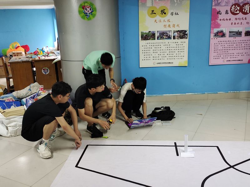 赛前,创想创客协会通过QQ空间、二课报名等途径宣传活动,于QQ群内对未组队的同学进行分组。周日下午两点整,志愿者将比赛赛道图纸贴至文化园,并进行签到和比赛计时等准备。随着参赛同学陆续到齐,协会志愿者组织参赛者进行签到,于赛道上尝试循迹车,针对出现的问题进行现场调整。