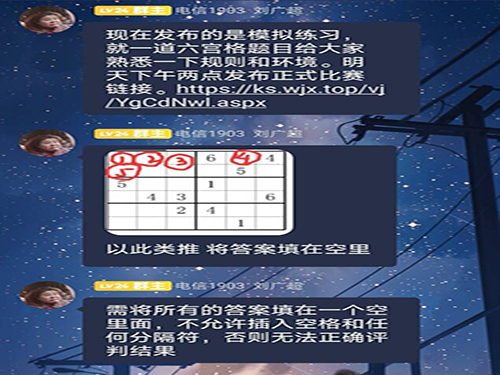 比赛开始前一天,数独协会负责人刘广超于比赛群中发布模拟练习,使参赛成员熟悉此次线上比赛的规则和环境。同时,由于线上比赛的特殊性,负责人特别告知参赛人员不得在空中插入空格和分隔符。如有违反,则无法评判结果。