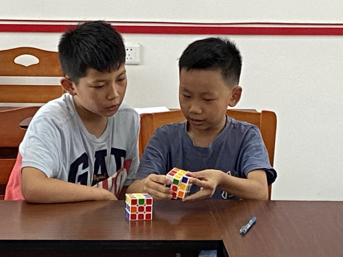 单独教学辅导后,孩子们投入到了热烈的练习。其中不乏天赋异禀的孩子和有魔方基础的孩子,孩子们相互学习,共同进步,不仅增进了同学感情,还学到了魔方拼接的技巧。此外,课下同学兴致不减,跑向老师请教魔方知识,老师诲人不倦,亲切接待每一位孩子的请教。