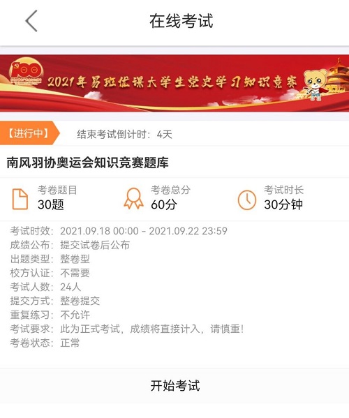 为普及羽毛球奥运知识,同时提高同学们体育运动能力、激发同学们对羽毛球的热爱和关注意识。南风羽毛球协会于9月18号于易班APP举办线上羽毛球奥运知识竞赛活动。