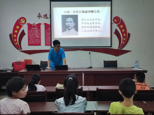 紧接着进入诗词鉴赏环节。本次鉴赏的诗词是《七绝·改西乡隆盛诗赠父亲》和《七绝·咏蛙》。张耀先声情并茂地朗诵了这两首诗词,然后利用PPT以图文并茂的形式,用通俗易懂的语言诠释了这两首词地感情。诗中运用浪漫主义手法描写出人物故事,通过张耀逐字逐句的分析讲解,仿佛把孩子们带到艰苦的革命斗争年代。同学们表现出对于诗词学习的强烈好奇心和求知欲,被诗词中蕴含的志在四方的远大抱负和忧国忧民的深厚情怀所感染。最后大家一起齐声诵读结束了这一环节。