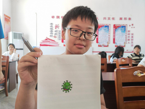 活动最后一个环节是设计口罩,童心绘画。同学们看了谢老师的动画展示后,纷纷有了自己的灵感,在纸上画下医护人员、冠状病毒等元素。“老师你看,我在口罩上写了‘哪有什么岁月静好?只是有人在替你负重前行’。”“我希望病毒可以被快快消灭,这样我们就不用带口罩了!”防疫安全课绘画环节上,孩子们争着向谢于瑞展示自己设计的口罩。