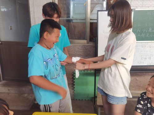 有的孩子也采用弹性绷带和纱布进行手臂包扎,实践团成员考虑到对于小孩子来说,太难的包扎反而可能会起反作用,因为小孩子的学习能力有限,所以采用纱布和弹性绷带进行简单包扎处理,并且告诉孩子们一旦受伤,第一时间一定要求助大人,父母或者路人都可以,但一定要注意不要被陌生人拐骗。