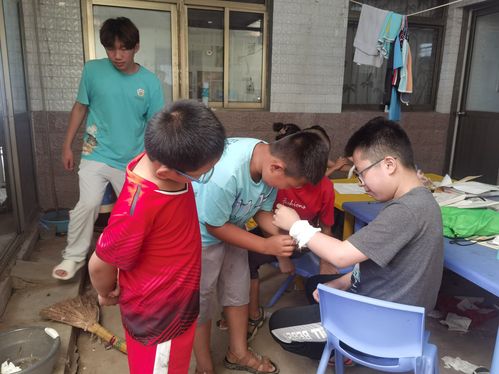 孩子们也认真实践,认真学习,实践团成员在旁观看指导,确保孩子们包扎的正确性,孩子们认真学习包扎的样子,就是对生命的一种尊重与敬畏。