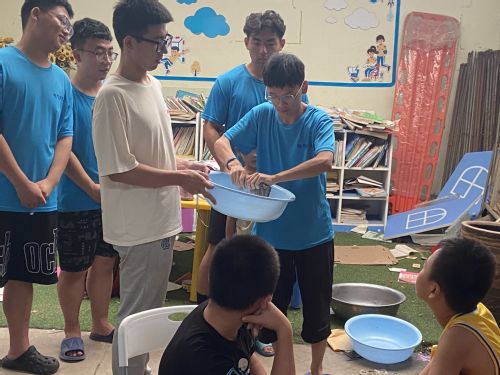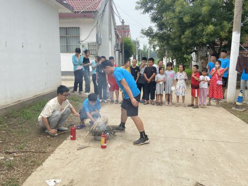 疏散过程用时一分钟,所有师生安全迅速的疏散至空旷区域待命,在李景旗短暂的指正点评后,开始了第二项--灭火器使用的演示和实际操作。在空旷区域内,实践团成员为员工们讲解灭火器的使用方法,并在保证安全的情况下在铁盆中点燃部分干柴。