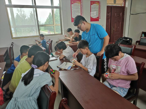随后实践团成员张耀开始给孩子讲解如何把魔方复原,从复原底层开始讲起,孩子们跟着老师的讲解进行实操,很快就学会了复原魔方的底层,之后孩子们便请求老师讲解如何复原魔方的中间层,相比复原底层,复原中层显然是更难的,需要保证底层不被打乱的情况下进行复原,虽然在复原的过程中也遇到了很多困难,但孩子们没有半途而废,而是迎难而上,主动向老师请教。由于魔方具有一定的难度,孩子们不能一堂课就完全掌握,所以菏泽支队开设了五堂魔方课让孩子们系统地学习魔方。最后,第一堂魔方课在孩子与老师的讨论声中结束。