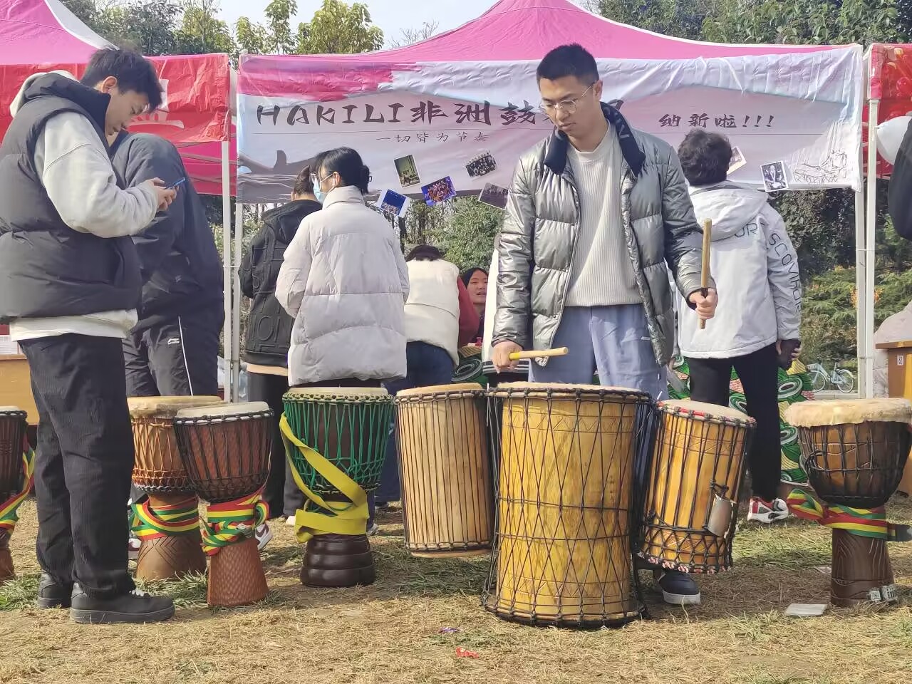 为了保证社团有新鲜的血液的注入,有足够高素质的后备力量,能更有效地开展社团相关工作,实现社团的新老交替,培养和壮大爱好非洲鼓队伍,HAKILI非洲鼓社团于11月3日上午在逸夫图书馆南侧草坪上举行非洲鼓社团纳新活动。HAKILI非洲鼓社团常驻志愿者袁宁、田连硕等同学负责组织策划本次纳新活动。