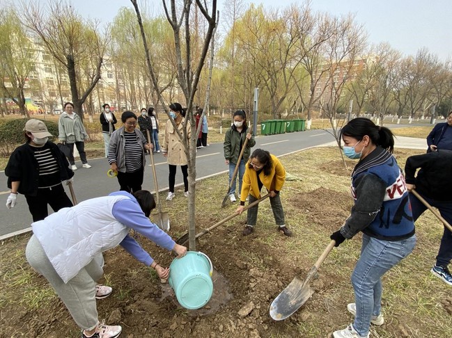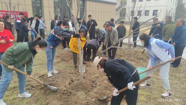 挥锹铲土、扶木正枝、培土浇水……两人一组、五人一队,现场一片热火朝天的劳动景象。大家干劲十足、分工明确、配合默契,每一道工序都一丝不苟,每个流程都认真细致。在大家的共同努力下,一棵棵新栽种的树苗迎风挺立,在明媚的春光中展露出蓬勃生机。