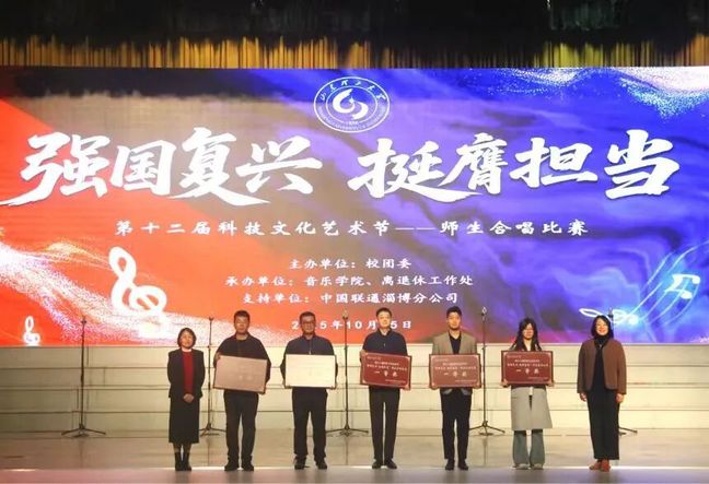 在山东理工大学第十二届科技文化艺术节“强国复兴 挺膺担当”师生合唱比赛中,fun88官网体育合唱团以铿锵有力、富有感染力的演唱荣获一等奖!