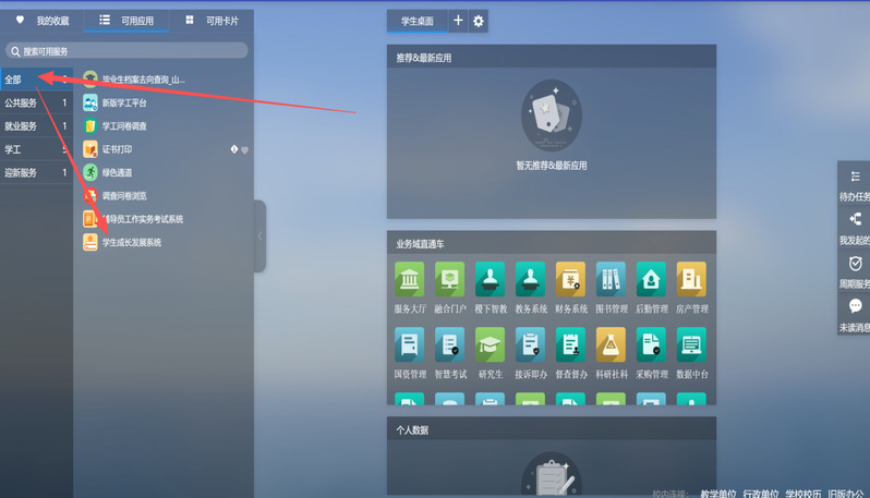 3.在“可用应用”-“全部”里找到员工成长发展系统并点击进入服务。