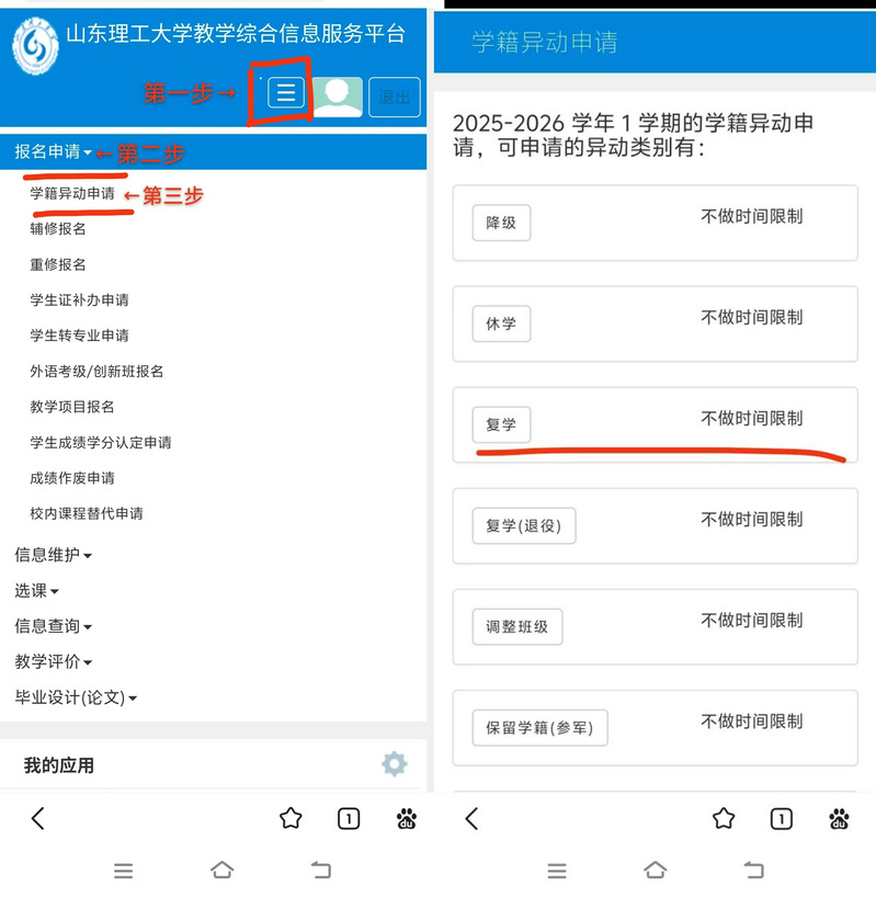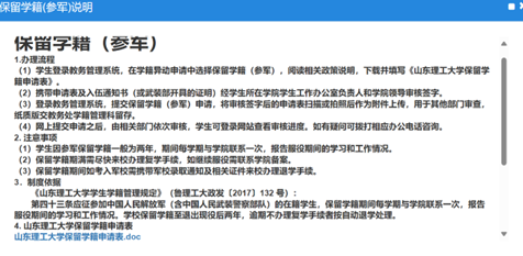 (1)员工登录教学综合信息服务平台,在学籍异动申请中选择复学(退役),阅读相关政策说明,下载《山东理工大学复学申请表》。