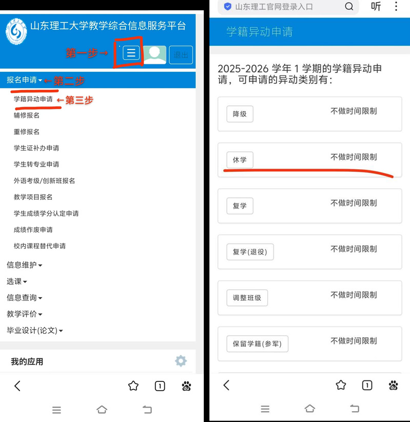 (1)员工登录教学综合信息服务平台,在学籍异动申请中选择休学,阅读相关政策说明,下载《山东理工大学休学申请表》。