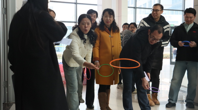 比赛中,参赛队员默契配合、各显神通:“连上幸福”环节考验团队协作与手眼协调,大家屏息凝神精准接球;“圈住幸福”欢声不断,大家瞄准目标、各显身手,小小的套圈圈住了礼物,更圈住了节日的喜悦与温情;“敲击幸福”项目更是将气氛推向高潮,清脆的敲击声与欢笑声交织成欢乐的乐章。现场加油声、欢呼声此起彼伏,气氛热烈非凡。